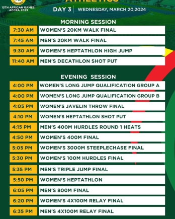 Athletics at the African Games-Accra 2023 enters Day Three today with the hosts looking to bounce back in the relay sprints tonight.