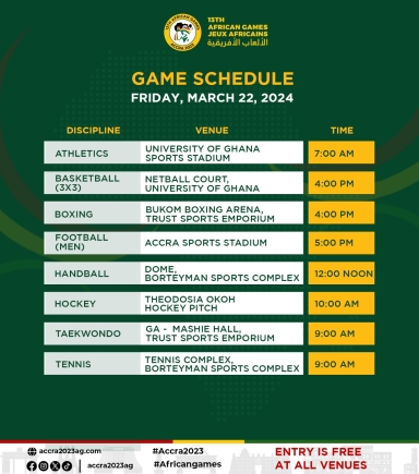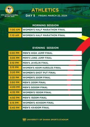 The penultimate day of the African Games, which concludes tomorrow, March 23, 2024, kicks off at 7 am with the women's half marathon final and concludes at 10 pm with the men's football final.