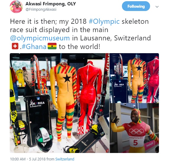 Frimpong took to Twitter to express his delight: "Here it is then; my 2018 #Olympic skeleton race suit displayed in the main @olympicmuseum in Lausanne, Switzerland 🇨🇭.#Ghana🇬🇭 to the world!".