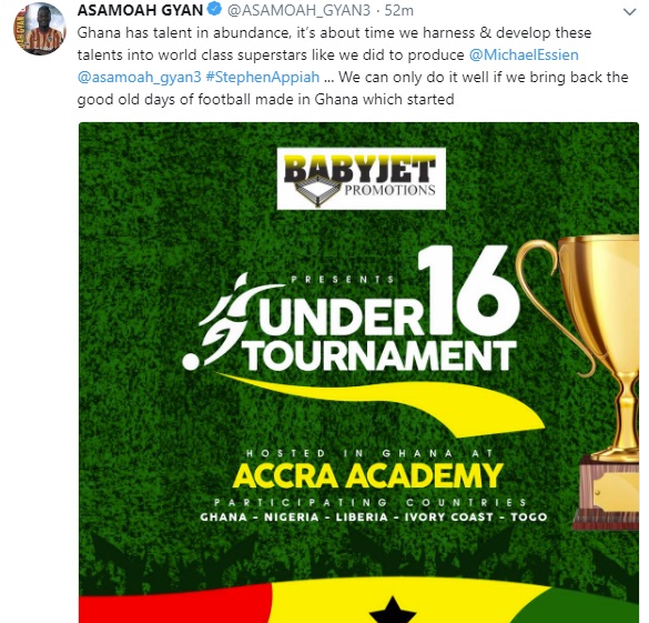 Commenting about the tournament is separate posts on Twitter, Gyan explained that it was time to harness the abundance of football talents to produce superstars like himself, Stephen Appiah and Michael Essien.