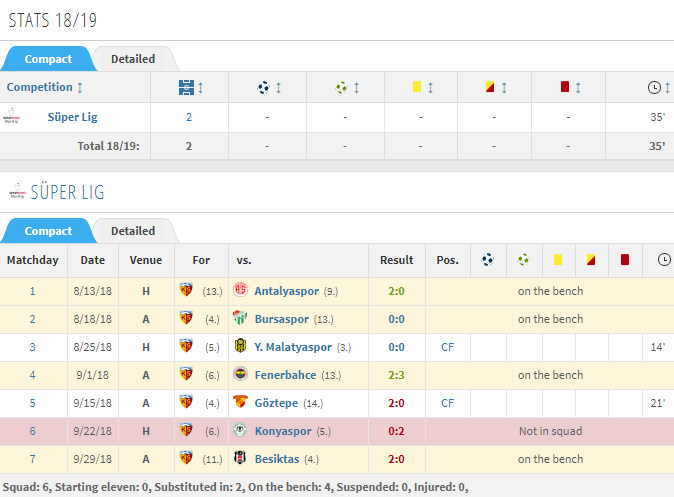 According to transfermarkt.co.uk, his two appearances in the Turkish Super Lig saw him come on for 14 minutes in a 0-0 draw with Malatyaspor before playing for 21 minutes at Gotzepe.