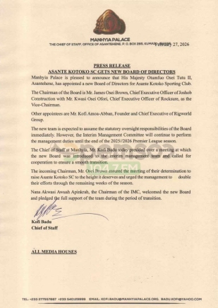 “Manhyia Palace is pleased to announce that His Majesty Otumfuo Osei Tutu II, Asantehene, has appointed a new Board of Directors for Asante Kotoko Sporting Club,” the statement said.