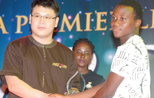 The Promising Player of the Season, Abdul Alidu Hudu (right) of Inter Allies receiving his award from a representative of StarTimes, sponsors of next season’s Premier League.