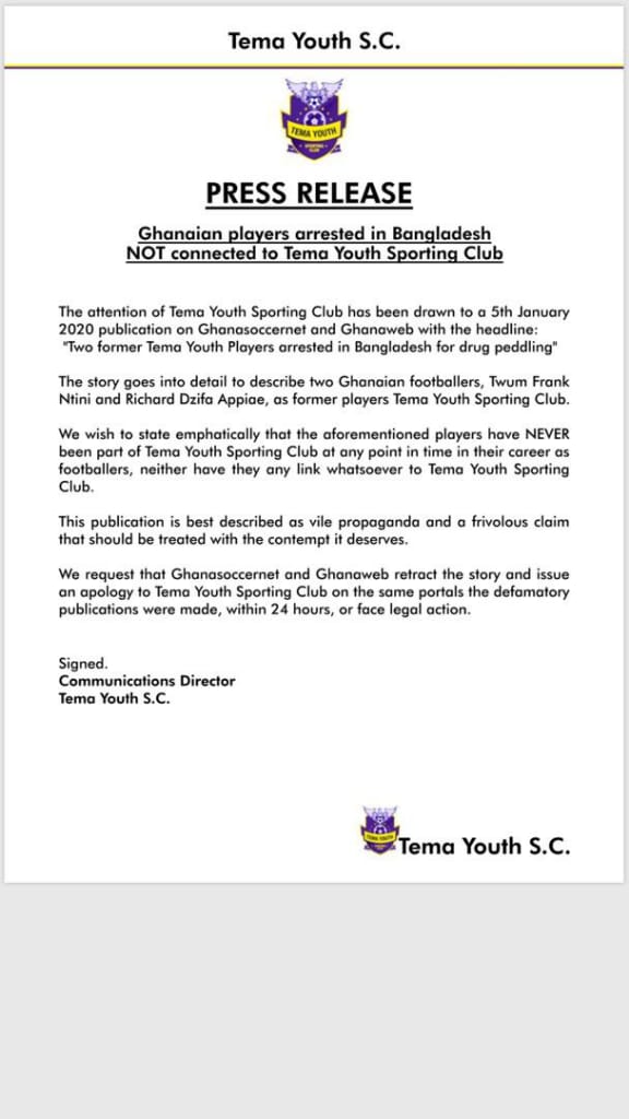 "We wish to state emphatically that the aforementioned players have NEVER been part of Tema Youth Sporting Club at any point in time in their career as footballers, neither have they any link whatsoever to Tema Youth Sporting Club," the statement said.
