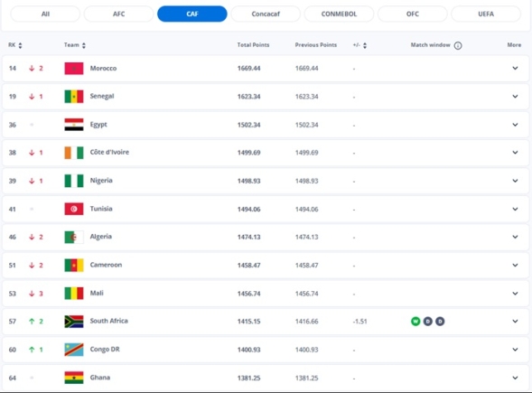 On the African continent, Morocco, Senegal, and Egypt occupy the top three positions ahead of Ghana, who currently sit at 12th.