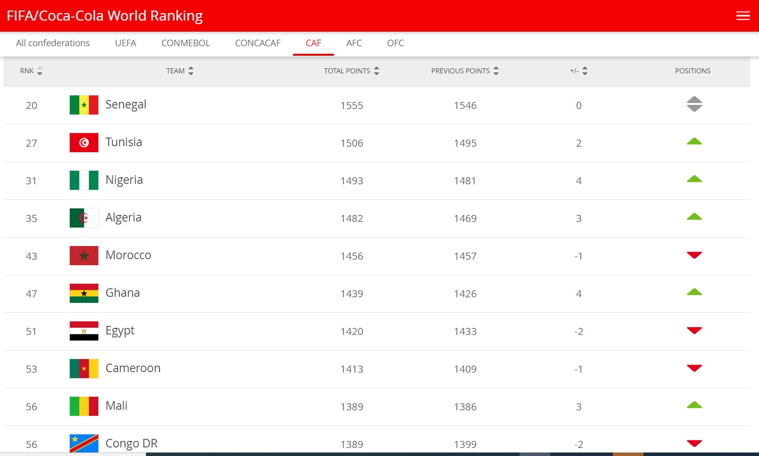 The Black Stars are now the sixth-highest ranked country on the African continent behind Senegal (1), Tunisia (2), Nigeria(3), Algeria (4) and Morocco(5).