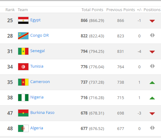 The Stars also kept their place at the ninth best team on the African continent. Egypt is Africa’s highest ranked team in the world despite slipping down one place to 25th position in the overall ranking.