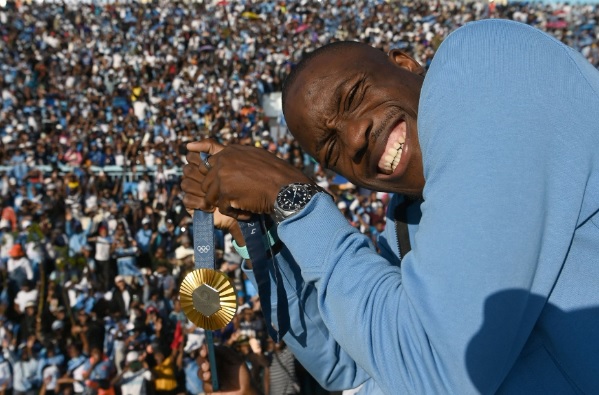 The athletes paraded the National Stadium on a rooftop bus, waving at fans enjoying a half-day holiday declared by the president to celebrate Tebogo's success.