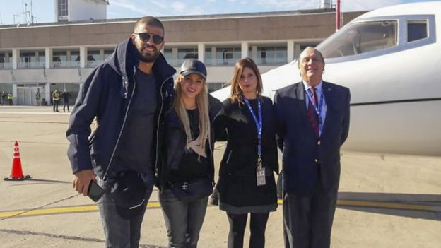 Gerard Piqué (left) and his wife Shakira posed for a picture with airport staff as they arrived in Rosario
