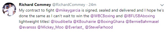 Former Commonwealth lightweight title holder, Richard Commey has confirmed that he has put pen to paper on a contract to fight Mikey Garcia (39-0, 30 KOs) for the WBC and IBF lightweight world titles.