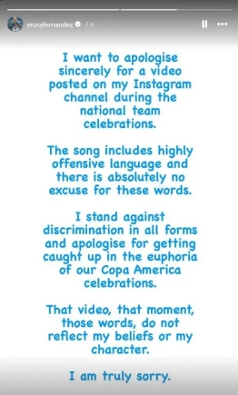 Fernandez said he is "truly sorry" for the video he posted as Argentina celebrated winning the Copa America.