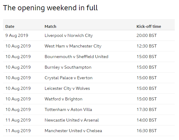 The 2019-20 Premier League season will start with Champions League winners Liverpool hosting promoted Norwich City on Friday, 9 August. The opening weekend will also see Manchester United host Chelsea on Sunday, 11 August.