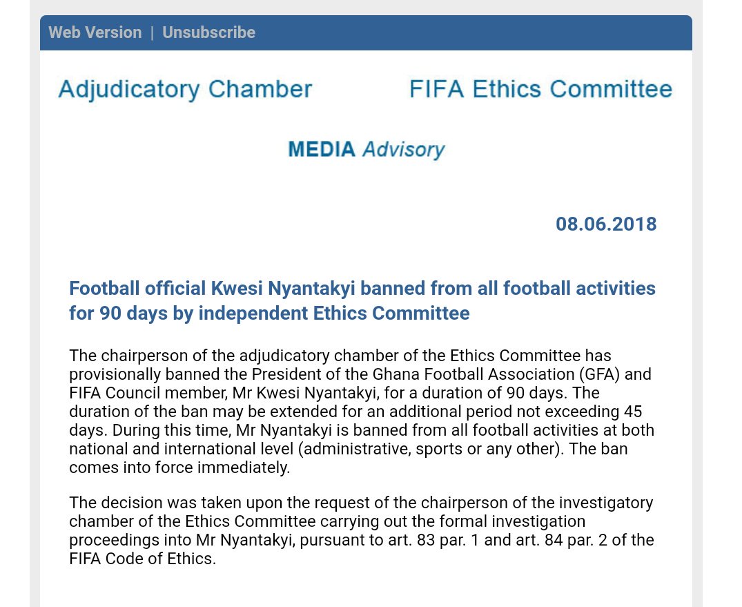 During this time Nyantakyi, who doubles as a FIFA Council member is banned from all football activities at both national and international level.
