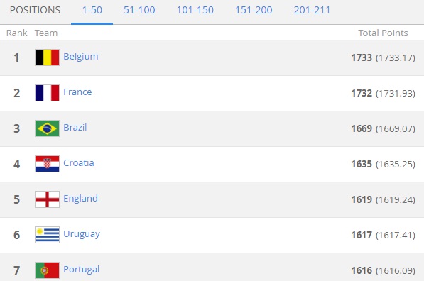 The top two remain out in front after a month in which each of them enjoyed a win and a draw, with Belgium and France beating Switzerland (8th, unchanged) and Germany (14th, down two) respectively in the UEFA Nations League and emerging with honours even from matches against the Netherlands (15th, up 2) and Iceland (36th, unchanged).