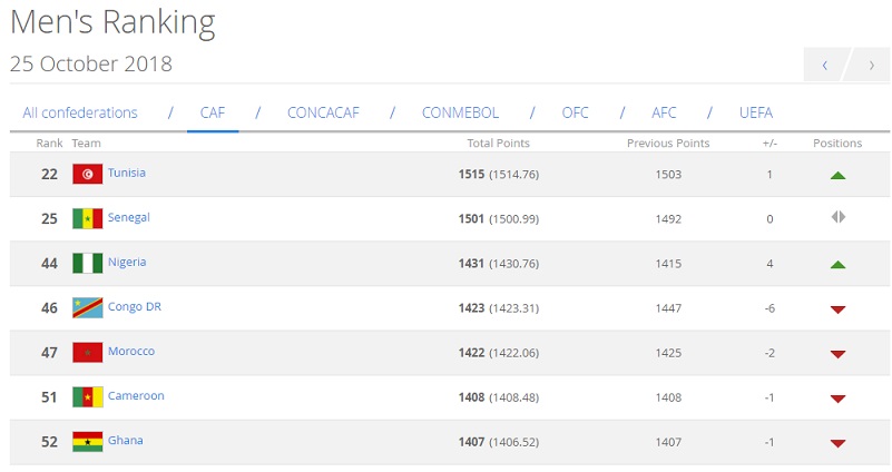 Ghana's senior national team, the Black Stars have inched a spot down from 51st to 52nd place on the FIFA/Coca-Cola World Ranking released for October after not featuring in any fixture during the period under review.