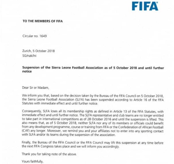 World football governing body, FIFA has announced the suspension of Sierra Leone from international competition 'with immediate effect' due to government interference in the running of the country's Football Association.
