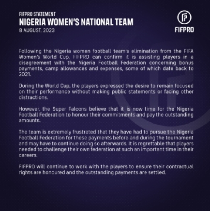 International Football Player’s Union (FIFPro) has released a statement offering its assistance to players of the Nigeria Women’s Football Team, Super Falcons, to receive bonuses owed them by the Nigeria Football Federation.