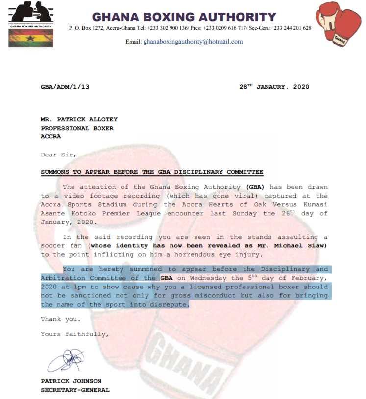 The Ghana Boxing Authority (GBA) has summoned WBO Africa Super Welterweight Champion, Patrick Allotey to appear before its Disciplinary and Arbitration Committee on Wednesday, February 5, 2020.