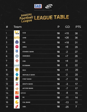 GCB finished the 16-week competition with 38 points and a goal difference of +15, narrowly surpassing UMB, who amassed 36 points with a superior goal difference of +26. National Investment Bank (NIB) took third place with 31 points and a +18 goal difference.