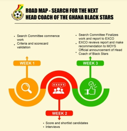 The Ghana Football Association has announced the roadmap to hire the next Black Stars coach and named a five-member search committee to evaluate and recommend a candidate to the Executive Council for approval.