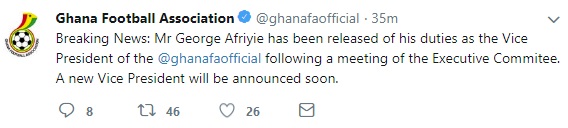 The tweet read: "Breaking News: Mr George Afriyie has been released of his duties as the Vice President of the @ghanafaofficial following a meeting of the Executive Committee. A new Vice President will be announced soon".