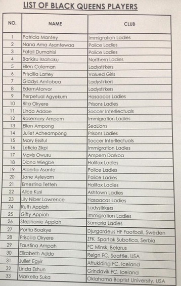 The foreign-based contingent are: Portia Boakye (Djurgadeus HF Football, Sweden), Priscilla Okyere (ZFK Spartak Subotica, Serbia), Faustina Ampah (FC Minsk, Belarus), Elizabeth Addo (Reign FC, Seattle, USA), Juliet Egyir (Attuklding FC, Iceland), Linda Eshun (Grindavik FC, Iceland) and Markella Suka (Oklahoma Baptist University, USA).