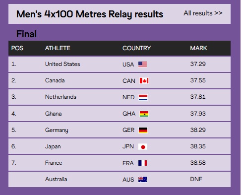 Germany (38.29s), Japan (38.35s), and France (38.58s) followed, while Australia did not finish.