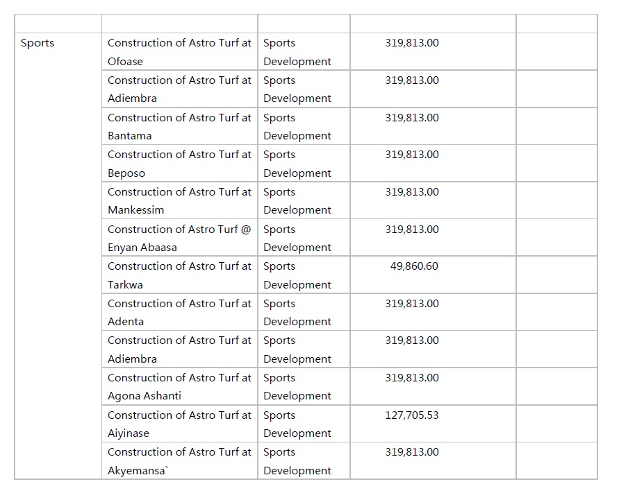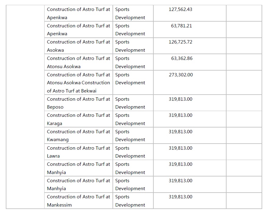 "The Minister told Parliament most of the Astro Turfs cost GHS1,599,065.00 each. To illustrate further with a few examples: according to the Minister’s parliamentary response, the Adenta, Karaga, Yendi, Mankessim, Adiembra, Akyemansa, Kumasi, Beposo and Bantama Astro Turfs cost GHS1,599,065.00 each which is absolutely in sharp contrast from PIAC’s report indicating that those same projects cost just GHS319,813.00 each".
