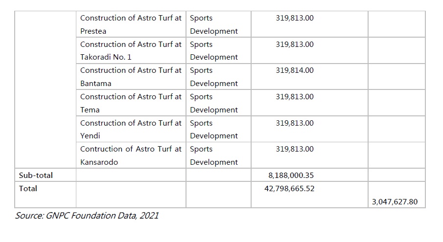The Ghana National Petroleum Corporation (GNPC) spent GH₵8,188,000 constructing 30 astroturf pitches in seven regions of the country in the year 2021.