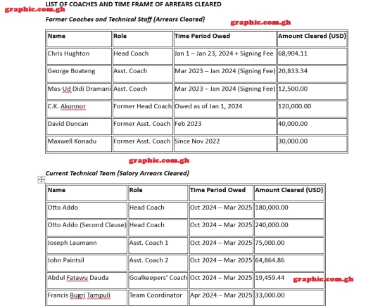Payments were also made to the current technical team, with Head Coach Otto Addo receiving $180,000 and $240,000 in two separate tranches for salary arrears between October 2024 and March 2025.