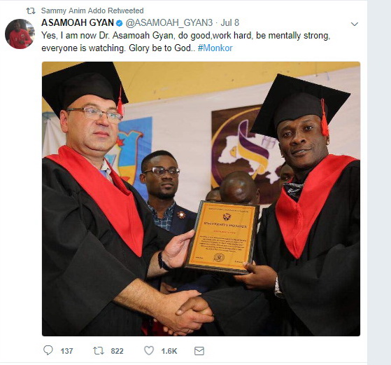 “Yes, I am now Dr. Asamoah Gyan, do good, work hard, be mentally strong, everyone is watching. Glory be to God..”