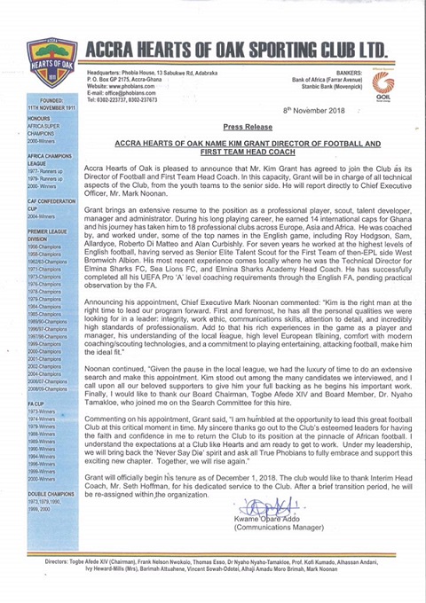 Accra Hearts of Oak has announced the appointment of former Charlton Athletic and Black Stars forward Kim Tyrone Grant as its Director of Football and First Team Head Coach.