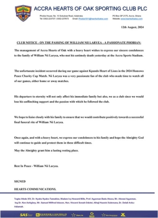 Hearts of Oak have confirmed the tragic passing of one of their loyal supporters, William Nii Laryea, who collapsed during their Gbese Mantse Homowo Cup match against Heart of Lions last Sunday.