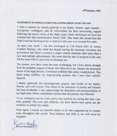 He was initially discharged in March 2021 due to witness complications and several adjournments, but was re-arraigned shortly after in another Accra High Court. In a letter expressing gratitude to his legal team, friends, and family, Nyantakyi reflected on the difficulties of the past few years.