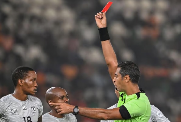 VAR gives it a look, and sure enough, RED CARD for Kekana who doesn't get a touch on the ball, and brings Moffi down! It's a last-man foul, and South Africa are down to 10 men! South Africa make an immediate change to accommodate the turn of events, as Zakhele Lepasa, only just on as a second-half substitute, is sacrificed for captain Nkosinathi Sibisi.