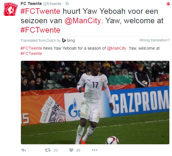 Dutch side, FC Twente today announced the signing of Ghanaian youngster Yaw Yeboah from Manchester City on a season-long loan deal.