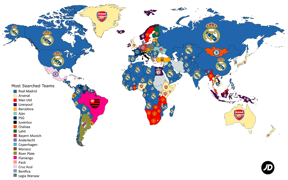 The study by JD Sports collated search data from Google on which football clubs in the world are the most popular in the world.