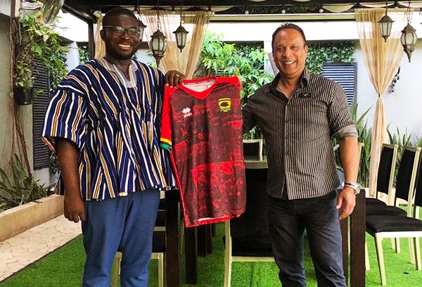 Kotoko CEO Nana Yaw Amponsah presents the club's jersey to the new head coach