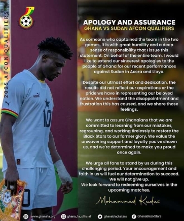 Mohammed Kudus has apologised following the Black Star's unimpressive showings in the recent Africa Cup of Nations qualifiers against Sudan.