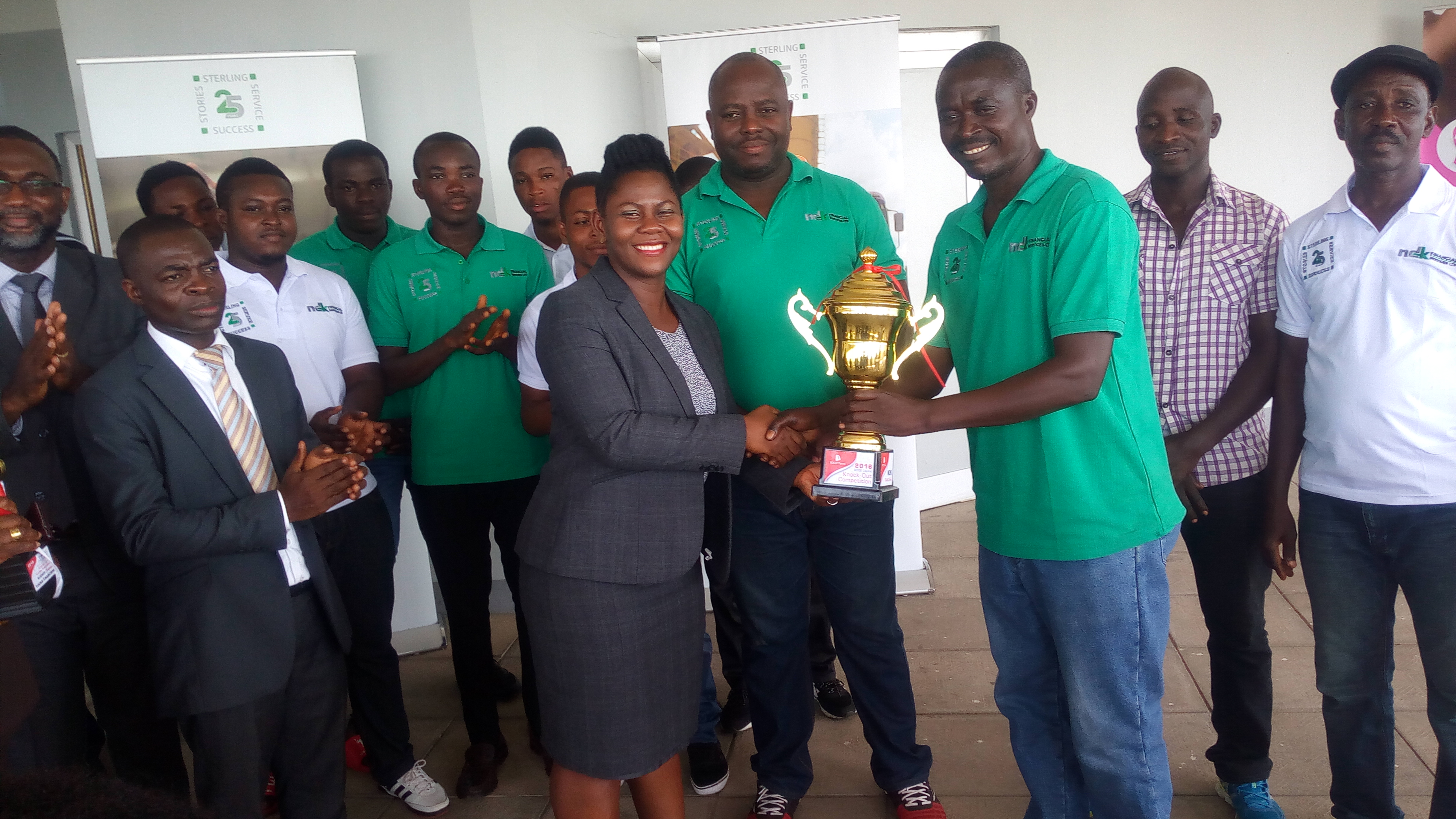 The winners of the BEIGE Capital Knock-Out (KO) hockey competitions, the NDK Financiers Seniors' and Junior Hockey clubs last Thursday presented their respective trophies to the management of their owners, NDK Financial Services at their offices in Accra.