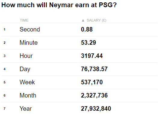 Every second Neymar spends as a PSG player, he will pocket 88p (or pretty much exactly €1). Every minute he earns over £53. Every hour? A cool £3,197.44.