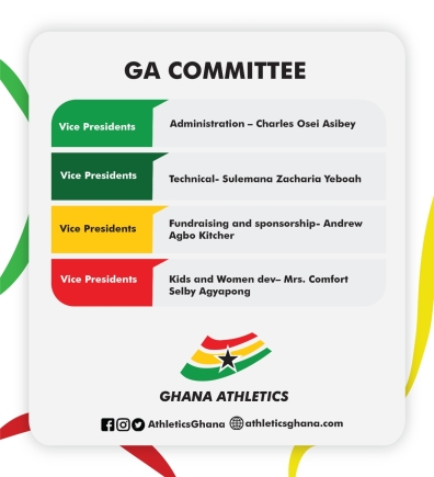 Mrs. Comfort Selby Agyapong, Vice President in charge of kids and women development in Ghana Athletics, joins the committee, along with Mr. Andrews Agbo Kitcher, assigned the key role of leading matters related to fundraising and sponsorships.