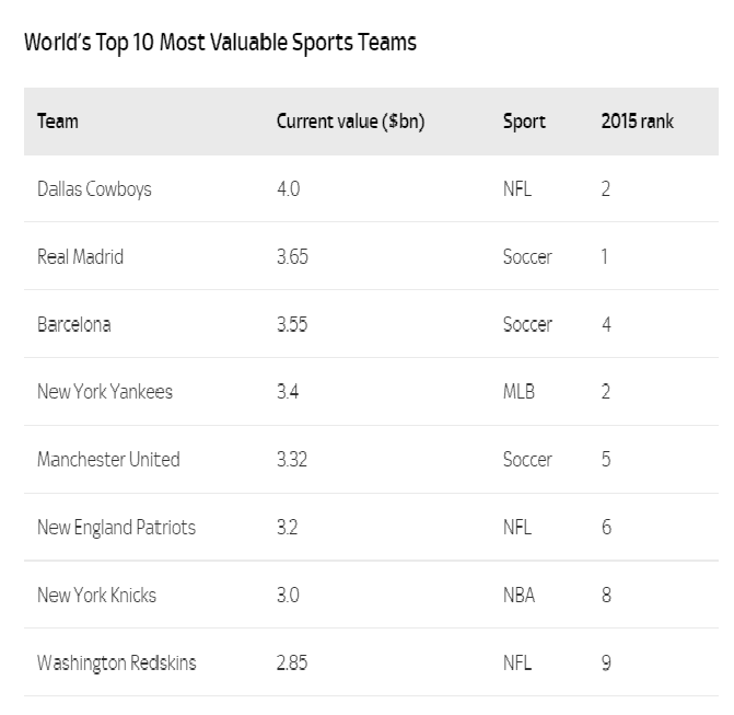 Major League Baseball team the New York Yankees at $3.4bn (£2.56bn) and basketball franchise the New York Knicks at $3bn (£2.26bn) are the only non-soccer and non-NFL teams in the top 10.