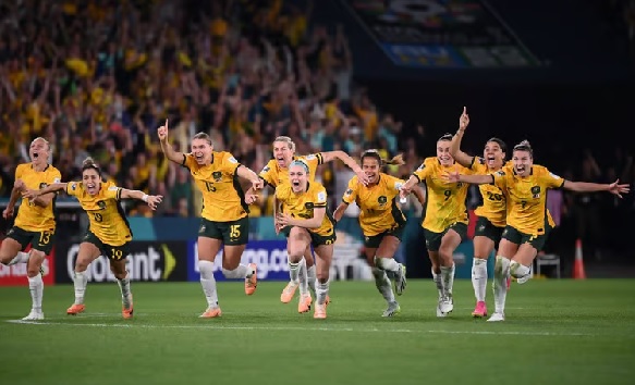 Australia players celebrate after Cortnee Vine scored the winning penalty in the shootout to beat France in the Women’s World Cup quarter-final