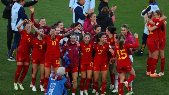 Spain players celebrate after progressing to the semi-finals of the World Cup in Wellington