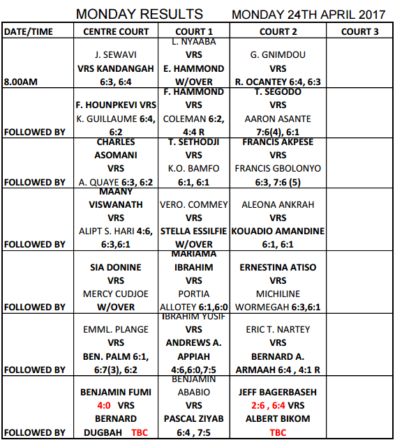 In the other first round clash, Francis Akpese progressed at the expense of Francis Gbolonyo at the end of two entertaining sets which ended 6-3, 7-6 (5).