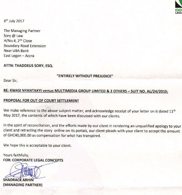 The letter signed by a Managing Partner of CPL, Shadrach Arhin states that: "In the spirit of reconciliation, and the efforts made by our client in rendering an unqualified apology to your client and retracting the story online on its portals, our client pleads with your client to accept the amount of GHC40,00 as compensation for what has transpired.
