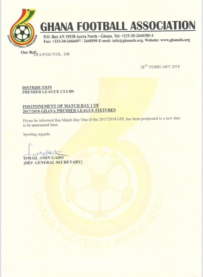 Below is the letter confirming the postponement of the Ghana Premier League indefinitely: