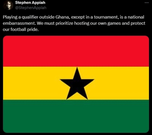 Appiah expressed his frustration in a tweet, stating: "Playing a qualifier outside Ghana, except in a tournament, is a national embarrassment. We must prioritise hosting our own games and protect our football pride."