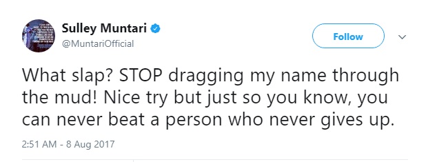 He posted: "What slap? STOP dragging my name through the mud! Nice try but just so you know, you can never beat a person who never gives up".